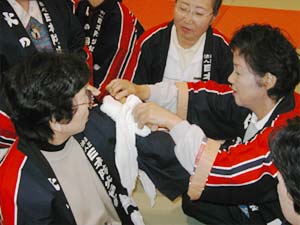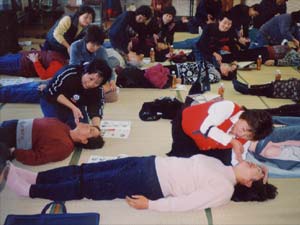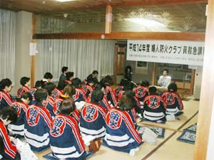 これは、当協会が平成12年度から開始した事業で、モデル地区を指定し、その地区の100名程度の婦⼈防⽕クラブ員が普通救命講習を受講するものです。平成14年度は20地域の婦⼈防⽕クラブが指定を受け、10⽉末までにほぼすべての団体が受講を終えることとなりました。