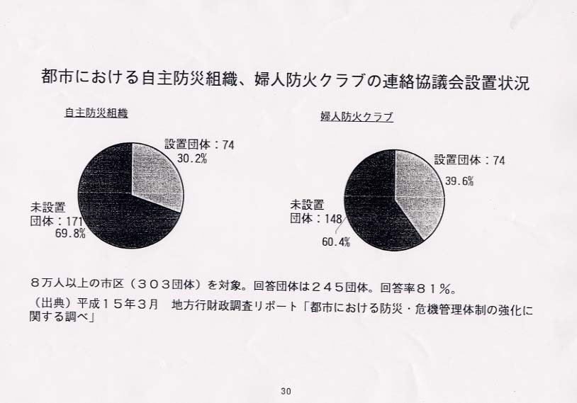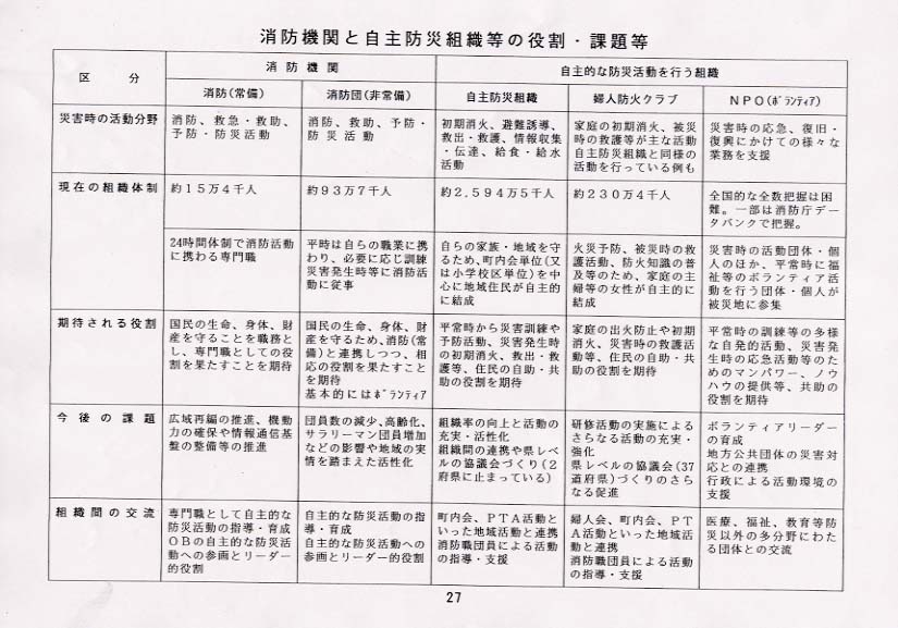 こうした施策推進の⼀環として、国・地⽅公共団体が⾃主防災組織に対し、教育訓練を提供する努⼒義務を定めた消防組織法の改正案を今国会に提出(6⽉中旬成⽴⾒込み)するとともに⾃主防災組織、婦⼈防⽕クラブ、NPO法⼈などのさらなる育成・活性化を図り、防災安全教育の充実、住宅防⽕対策のための新たな⼿法の導⼊などを検討するため、学識経験者、⾏政、⾃主防災組織関係者による懇話会を発⾜させ、去る5⽉29⽇、その第⼀回の会合が総務省内で開催された。