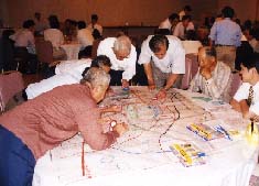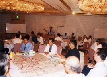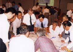 2⽇目の実技研修では、富⼠常葉⼤学環境防災学部の⼩村隆史講師から、地図に地域の様々な情報を書き込み⾃分たちの地域を知ることにより災害に備えるという「図上訓練DIG」を⾏い、参加者の⽅々からは、「災害が起きた際には『⾃分たちの地域は⾃分たちで守る』ということがいかに⼤切であるかを認識した、⾃分たちの地域でもこの図上訓練DIGをやってみたい。」との意⾒も寄せられました。