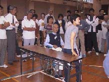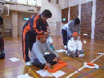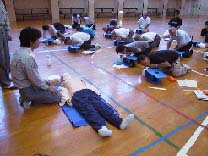 この後、福岡市城南区⽚江校区⾃主防災会の⽥原会⻑から福岡県における先駆的な活動事例を紹介していただくとともに、⾃主防災実技として、粕屋南部消防本部の職員から応急⼿当等を、また、福岡県⾝体障害者リハビリテーションセンターの職員から⾞いすを使った災害弱者の避難誘導等を指導していただきました。