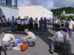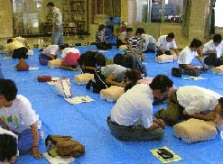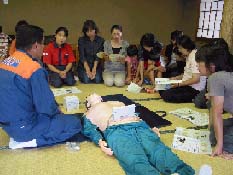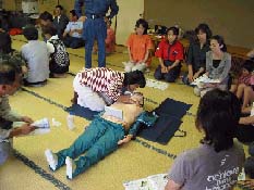平成15年9⽉9⽇・20⽇・23⽇の3⽇間に分けて、⽇本防⽕協会から交付を⾏った⼈体モデル(成⼈⽤・乳児⽤)及び応急⼿当講習テキスト等を活⽤して講習会が実施されました。