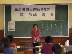⿅本郡⿅北町の⿅北町婦⼈防⽕クラブは、当協会より普通救命講習のモデル地域に選定されており、⿅北町婦⼈防⽕クラブ員118名が受講し、全員が真剣に取り組んでいました。