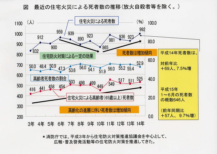 特に、平成14年中の同死者数は、992⼈(対前年⽐+69⼈、7.5%増、昭和61年(同死者数1,016⼈)以降としては最悪)、平成15年上半期(1⽉〜6⽉)の同死者数は、概数で646⼈(前年同期⽐+57⼈、9.7%増)と急増している状況にあり、今後、⾼齢化の進展とともに、さらに同死者数が増加するおそれがある。
