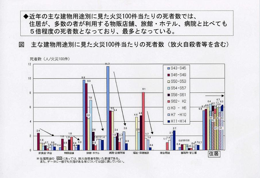 個⼈が私⽣活を営む場である住宅の防⽕責任は、当該個⼈が負うべきものではあるが、住宅防⽕に係る社会的な影響の⼤きさ、社会情勢の変化を踏まえ、従来個⼈の⾃助努⼒を中⼼に考えられてきた住宅防⽕対策について⾒直し、法制度化の導⼊を図ることが必要である。