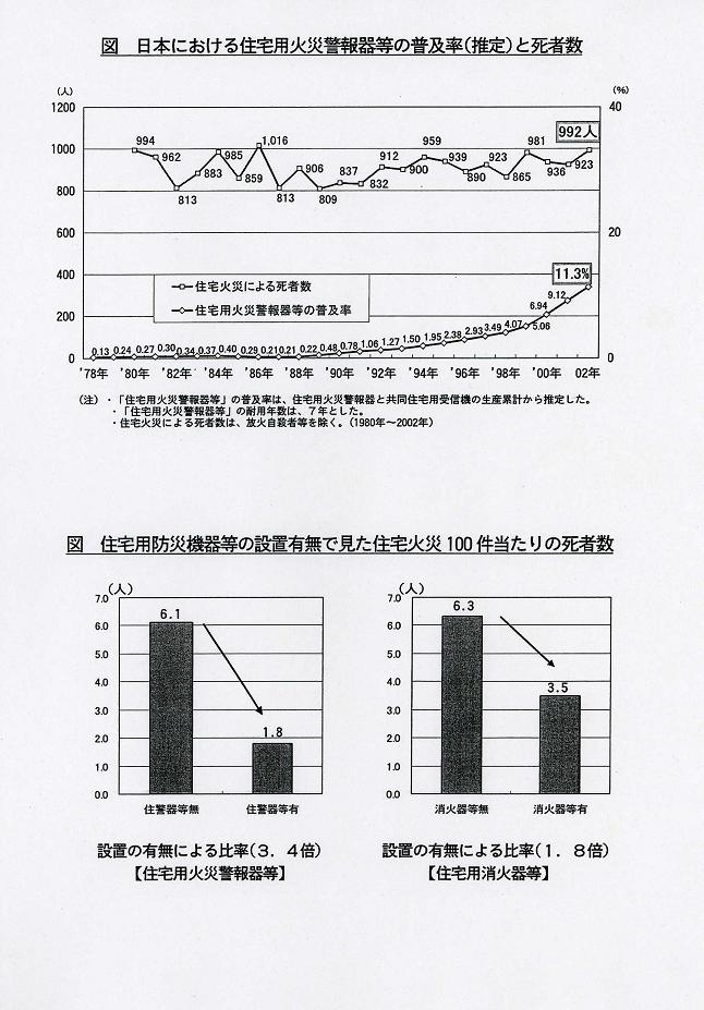 ⽇本では、消防法で⼀定規模の共同住宅等について消防⽤設備等の設置の法制度化が図られている⼀⽅で、⼾建住宅はその対象とされていないが、住宅については、消防法令の改正による規制強化が進められた特定⽤途の防⽕対象物と⽐べて出⽕件数当たりの死者数が著しく⾼いなど⽕災による死者の発⽣危険が他の⽤途に⽐べて⾼く、さらに隣家等への延焼危険性も⼤きいことから、住宅防⽕対策は単に個⼈の問題ではなく、市⺠社会における個⼈の責任を全うするためにも、居住者本⼈、家族、さらには地域社会への配慮を踏まえた対応が必要となっている。