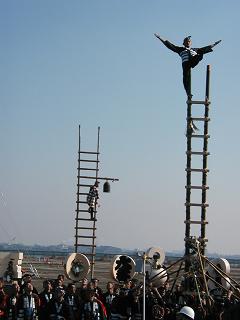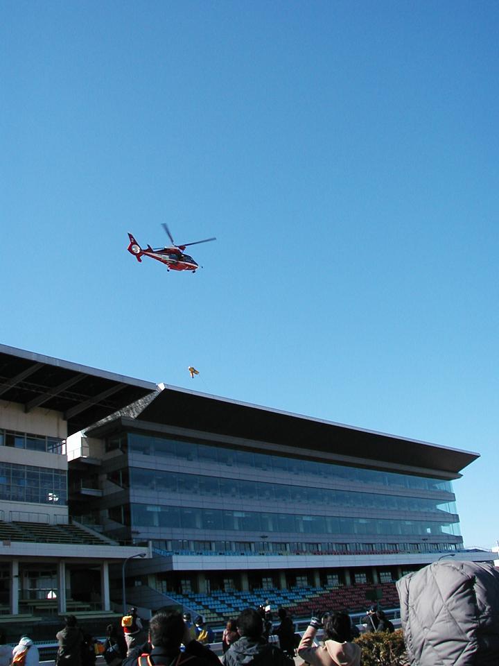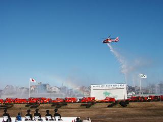 北風の強く吹く中、恒例の⽊遣流し・はしご乗りで始まり、競⾺場2階スタンドを⾼屋建物に⾒⽴てて、地震により建物が崩壊し、建物内に多数の逃げ遅れた⼈がいるとの想定で埼⽟県防災航空隊と救助隊・梯⼦隊が連携し、⾼所からの救出訓練、また分団⾞両及び航空ヘリからの⼀⻫放⽔が⾏われました。