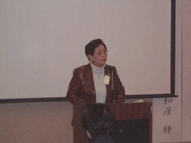 続いて、体験発表ということで、富⼭県婦⼈防⽕クラブ連絡協議会を代表して会⻑の松岡昌⼦様、⼭梨県⼥性防⽕クラブ連絡協議会を代表して会⻑の中澤智恵乃様よりこれまでの活動等をお話いただきました。松岡様は演歌の替え歌を活⽤した防⽕の運動等を報告され、中澤様からは⼭梨県全体まで視野に⼊れたこれまでの地道な体験をお話いただけました。飯⽥市からの参加者は先進的な取組みに刺激を受けることが出来ました。