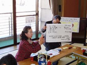 ここで休憩をはさみ、午後は昼⾷をいただきながらグループ討議からスタートしました。地元参加者と各県からの参加者、⾏政関係者共3グループに分かれ、「⽇常における婦⼈防⽕クラブの活動」、「災害時における婦⼈防⽕クラブの活動」、「婦⼈防⽕クラブ員の⾼齢化」をそれぞれ題材にして和気藹々のなか討議を⾏い、最後に各グループごとに討議結果の発表をし合いました。参加者⾃⾝で司会進⾏役、記録役、発表役を受け持ち、模造紙やポストイットを活⽤しながら、能動的な討議であったと思います。ここでは紹介しきれないほどの活動を持続させるための様々な⼯夫を意⾒し合えることができ、交流を通じた相互の意⾒交換の楽しさを実感できたようです。