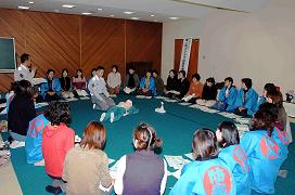 当⽇は、兵庫県婦⼈防⽕クラブ連絡協議会の前澤朝江会⻑、養⽗町⻑梅⾕馨⽒を招き、8時30分受付を開始、⼭崎たみ⼦建屋婦⼈防⽕クラブ会⻑をはじめ各防⽕クラブ役員、クラブ員130名が⼀同に集まり、9時より開会式、養⽗町⻑、前澤会⻑にご挨拶をいただき、その後9時30分からクラブ員119名が4会場に分かれ3時間の普通救命講習を実施しました。