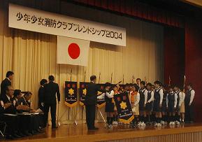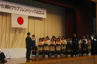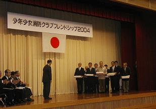 少年少⼥消防クラブ及び指導者の表彰式が、平成16年3⽉26⽇(⾦)午前11時より、東京都港区「三⽥共⽤会議所」において⾏われ、消防庁⻑官より、活動が、特に優良な少年消防クラブ(13団体)、優良な少年消防クラブ(32団体)及びクラブの育成・発展に寄与された少年消防クラブの指導者(10名)が、表彰されました。