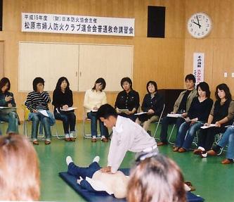 松原市婦⼈防⽕クラブ連合会は平成15年10⽉27⽇〜29⽇の3⽇間にわたり、松原市消防本部で(財)⽇本防⽕協会が主催する普通救命講習会を受講しました。