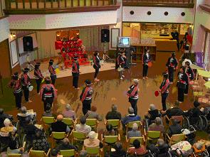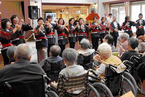 当⽇は、クラブ員による⽇本舞踊や歌⼿北島三郎さんの「平成⾳頭」などの曲に会わせた踊りを披露しました。最初は⼿をたたいて⾒ていただけの⼈たちも、最後にはクラブ員といっしょに踊るなど、盛会のうちに訪問を終了しました。