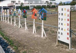 揖南少年消防クラブでは、⼭⽕事防⽌看板を10枚製作しました。掲⽰時が2メートルとなる⾼札型で、アニメのアンパンマンが「⼭⽕事、防ごう︕」と呼びかけている絵、「⽕から守る」と⼩⿃が⽔バケツで⼭⽕事を消している絵など、⼦供らしい発想で描かれています。