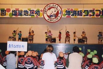 塩釜地区管内の幼年消防クラブ員約900名が集まり、クラブ員全員で遊戯を⾏い、20周年記念にクラブ員が和太⿎を披露し⼤きな歓声があがっていました。