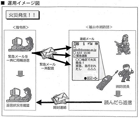 福⼭市消防団では、災害情報配信システム「パワフル消防団」を利⽤し⽕災時、登録団員の携帯電話に⽕災情報メールの⼀⻫配信を開始しました。