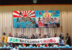 第2部のアトラクションは、「津⼭町 別れても⼼はひとつ ⽕の⽤⼼」と、離れ⾏く津⼭町を惜しみながら、防⽕防災に対する意識の啓発を図る威勢のいい出し物も披露されるなど、各地区の防⽕クラブ員が唄や踊りを披露し⼤会を盛り上げました。