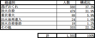 | (1) ⽕災種別ごとの死者発⽣状況 死者1,502⼈について⽕災種別ごとにみますと,次表のとおりです。 ![]() |