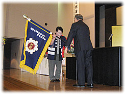 また、来賓として出席された新潟県 小熊博副知事、総務省消防庁 飯島義雄防災課長、財団法人日本防火協会 秋本敏文理事長、財団法人新潟県消防設備協会 早川武美理事長から祝辞が述べられ、その後、新潟県女性防火クラブ連絡協議会旗が、秋本理事長から橋本会長に授与いたしました。