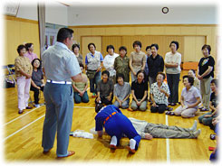 心肺蘇生訓練人形(成人、小児各1体)・AED(自動体外式除細動器)トレーナー・三角巾・キュウマスクが交付され、那覇市消防本部救急課の救急指導係長を中心に、職員と救急隊員延べ13名が講師となり女性防火クラブ員に対し、応急手当の重要性・心肺蘇生法(実技)・AEDの使用法・止血法の普通救命講習Ⅰが実施されました。講習会場で放映されるDVDに登場してくる、インストラクターの手技を見ながら、同時に受講者が手技を実習するという画期的な方式を採用し、受講者全員に普通救命講習修了証が手渡されました。