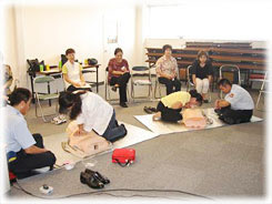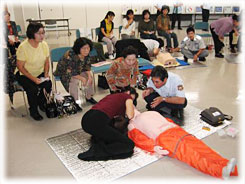 那覇市は沖縄本島の南部に位置し、沖縄県の県都として、 人口31万人余を有し、面積は39.23k㎡と人口密度の高い都市です。今回那覇市消防本部では、(財)日本防火協会の助成事業により平成20年度「婦人防火クラブ員救急講習会」の実施市町村選定を受け、那覇市女性防火クラブ員を対象に普通救命講習会を11月7日、8日、14日、15日の計4日間開催し、総勢56名が受講しました。