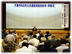 本日御講演をいただきます、新潟県小千谷市の自主防災組織連絡会の風間様には、新潟中越大震災を乗り越えられた体験と、今後の自主防災活動の指針となる貴重な教訓をお話いただけることに感謝します。(天童市自主防災会連絡協議会会長あいさつ)