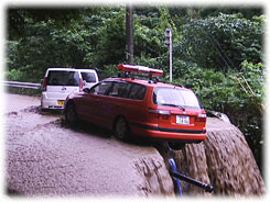 立ち往生した6台のうち4台が転落 平成22年7月3日深夜激しく叩きつける雨音で目覚め17年前死者17名の犠牲者を出した8.1水害を彷彿し思わず身震いをした。