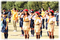 第二部 規律訓練では、高度救助隊が指導者となり、緊張した面持ちで「敬礼」や「まわれ右」等の動作を訓練しました。その後、子ども会連合会の高校生リーダーの号令に合わせ、訓練成果を披露しました。