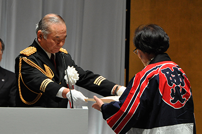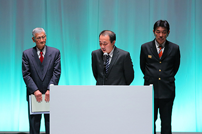 最後に、稲山消防庁長官から発表者に記念賞授与をした後、(公財)日本消防協会 秋本会長の閉会のあいさつで、式典を終了いたしました。