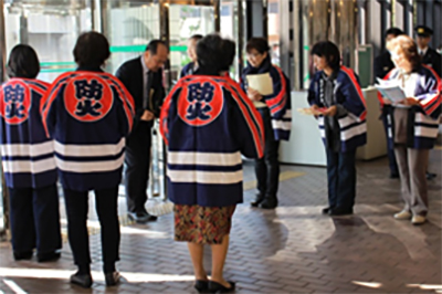 団員は来店される方に、「火の用心をお願いします!」 「住宅用火災警報器の設置をお願いします!」と元気よく、