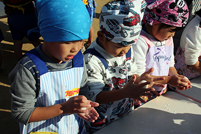 岡山保育園幼年消防クラブは平成29年12月6日(水)、防火防災活動の一環として、防火餅つきを行いました。子ども達は寒い中、顔に白い粉をつけ、餅に思いを込めながら、一生懸命に餅をこねました。