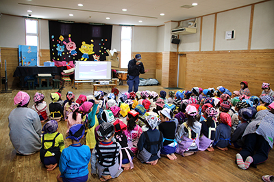 劇団員と一緒にクラブ員が歌ったり、踊ったりした後、防火の内容が盛り込まれたミュージカル「かちかち山」~防火編~を鑑賞し、楽しみながら防火に対する意識を芽生えさせることができました。
