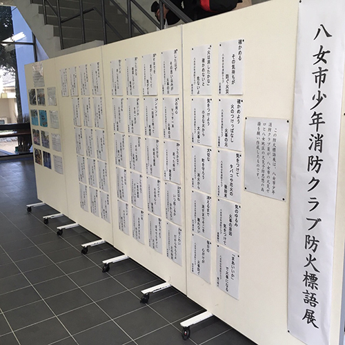 八女消防本部は、平成30年1月17日(水)から31日(水)までの2週間、八女市少年消防クラブによる防火標語展を八女市民会館おりなす八女で、広川町少年消防クラブによる防火・防災絵画展を広川町町民交流センターで実施しました。