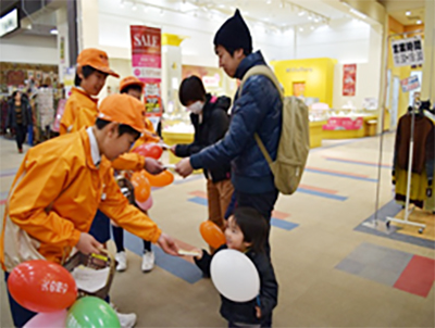 防火チラシを折り込んだポケットティッシュと火の用心の名入り風船を配布しました。ポケットティッシュを手渡すと、