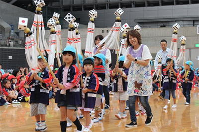 大会は参加者全員で「火の用心のうた」を合唱、6台のみこしが会場を練り歩き、まといを持った園児たちが「わっしょい・わっしょい」の掛け声で会場を盛り上げました。