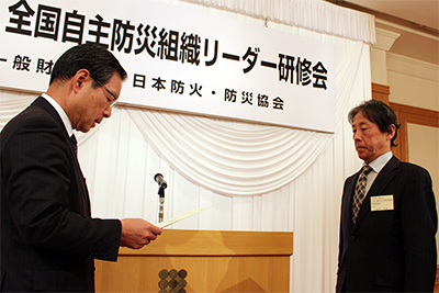 研修会参加者の中から代表者に、当協会の理事長 西藤 公司より研修会修了証を授与した後、今回の研修会参加に対するお礼と、自主防災組織の益々の活躍を期待しますと閉会の挨拶を申し上げました。