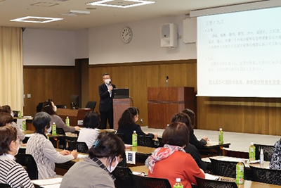 研修会冒頭、平井会長の主催者挨拶、北海道総務部危機対策局 木戸消防担当課長の来賓挨拶があり、引き続き元札幌市危機管理対策室長であり現(株)札幌副都心開発公社代表取締役社長である中塚宏隆氏による「災害と地域防災」と題した講演があり、雲の性質や風の仕組みなど気象現象についてや、最近の風水害、地震被害についての説明があり、天気予報に関してのクイズを交えながら参加者に分かりやすく話していただき、研修会を終えました。