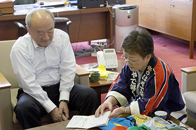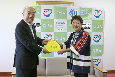 令和2年9月30日(水)五泉市の伊藤市長のもとを訪れた西脇孝子会長は「自分で準備が難しい人もいるので、防火防災グッズとして、ぜひ役立ててほしい。会の活動を、多くの人に知ってもらうきっかけにもつなげたい」と100個を五泉市に寄贈しました。寄贈を受けた市では福祉施設で役立てるとのことです。