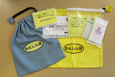 そしてこの度、新型コロナウイルス感染拡大を受けて「自分たちができることをしよう」と市内の飲食店や電気店から協賛を受けて、ウェットティッシュ、ポケットティッシュ、使い捨てカイロ、傷バンドが入った「あんしん袋」を作成しました。