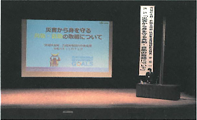 講演では、宮城県復興・危機管理部防災推進課の地域防災班長である 千葉一成様から「災害から身を守る共助・自助の取組について」と題して御講演いただきました。