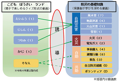 防災について、親子で一緒に学べる、子供も親しみやすい「こども ぼうさい ランド」をトップページとしました。保護者が学びを深める「防災の基礎知識」もタブのクリックで表示できます。具体的なサイト構成は以下のとおりです。