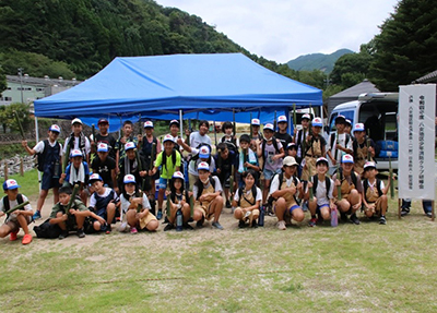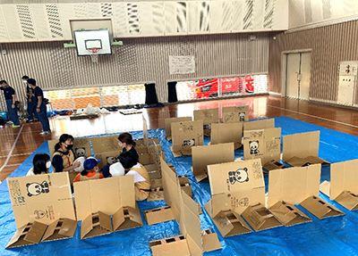 今回の研修では、各少年消防クラブが創意工夫を凝らし炊き出し訓練、避難所作成訓練、水難救助訓練、結索訓練、山火事予防啓発の看板作成等を行いました。炊き出し訓練では災害時を想定し、炊飯器を使わずにポリ袋と鍋、ガスコンロを使った米の炊き方を学びました。また、避難所生活を想定して段ボールを利用した簡易パーテーションの作成や個性あふれる山火事予防の看板作成などクラブ員たちは初めての体験にとても興味津々な様子で、どの訓練も真剣に取り組む姿を見ることができました。