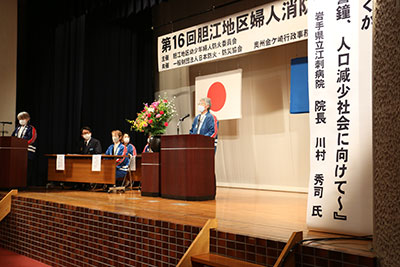 特別講演では、岩手県立江刺病院 院長 川村秀司氏をお招きして、「人生100年時代をどう生き抜くか~医療・介護現場からの警鐘、人口減少社会に向けて~」と題して講演いただきました。貴重な資料と医師としての経験をもとに多角的な知見からの講話は、聴講した会(隊)員皆が、これからの人生を豊かに過ごすためのすべを考える良い機会となりました。また、今後ますます核家族化、独居高齢者の増加が進むことが示され、地域防災における婦人消防活動の重要性を強く認識する機会にもなりました。