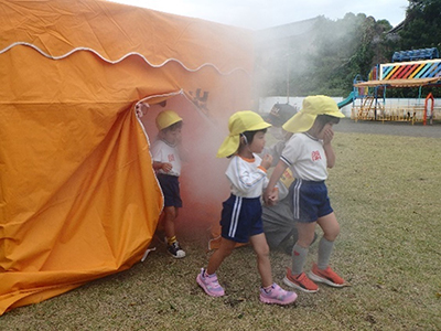 運動会は幼年消防クラブ員代表による、元気のよい「防火の誓い」で始まり、消火器を載せた「みこし」や「おもちゃ消防車」を使用するゲームや、組別対抗リレー、玉入れのほか、煙体験ハウス、放水体験、地震体験車での地震体験、救助工作車との綱引きなどを行いました。こども達には好評で「楽しかった」「煙の中は真っ白で何も見えなかった」「水をもう一回出してみたい」「地震の揺れが怖かった」といった感想がありました。保護者の方からは「体験コーナーが保護者も体験出来、防火防災の事を意識する良い機会になりました」と感想を頂きました。