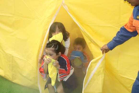 フェスタでは、消防職員による紙芝居、避難訓練、消防車両からの放水体験、消すゾウくんを使用した消火訓練、煙体験、防火衣着装体験等を行いました。その他にも、女性防火クラブ員が火遊びに関する寸劇や○×クイズを披露して、火の恐ろしさや火の正しい使い方を呼びかけました。