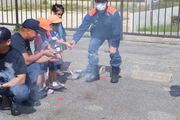 開会式では、参加した園児全員が「防火のちかい」を一斉に宣言しました。園児たちは、花火教室や放水体験、煙体験、消防クイズ、バケツリレー、防火紙芝居、防火防災ビデオの視聴、消防車の見学や写真撮影など8 つのブースを通じて、消防との交流を楽しみました。これらの体験を通じて、園児たちは防火の心を育むことができました。