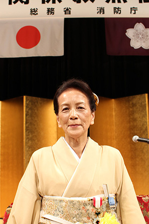 永年の功績が認められ、滋賀県女性防火クラブ連絡協議会 会長 山田 光代 様が公衆の利益に貢献した人に贈られる「旭日双光章」を受章されました。