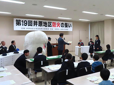 式典の様子 幼年消防クラブ員、少年消防クラブ員、女性防火クラブ員及び地域住民が集い、防火の意識・知識を高め、無火災運動の推進と防火思想の普及を図ることを目的に「第19回井原地区防火の集い」を約400人の来場者を迎え、令和6年11月17日(日)に開催しました。