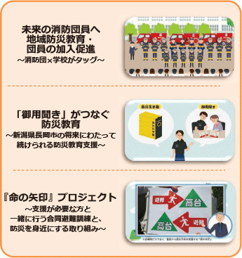 令和7年4月には、上記の図のとおり、「学校と地域が連携した防災力向上に関する取組」の3本の動画を追加しました。これらは、防災・減災・防火対策等の優れた取組を表彰する「防災まちづくり大賞」において、近年、総務大臣賞や消防庁長官賞を受賞した取組を題材にした動画です。災害に強い安全なまちづくりのための取組を検討する際に、ぜひご参考ください。