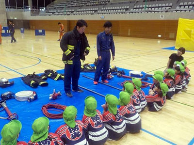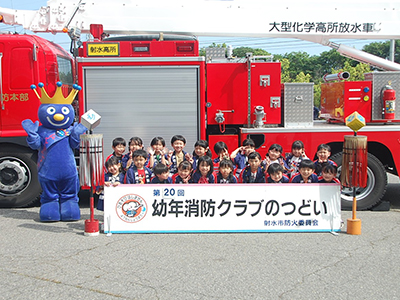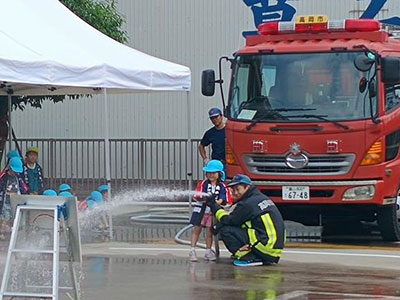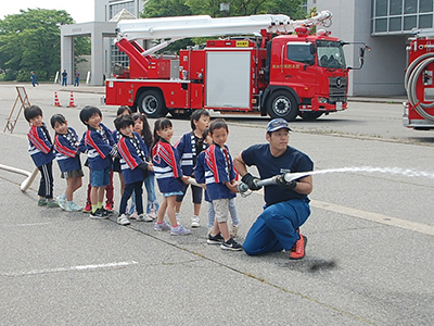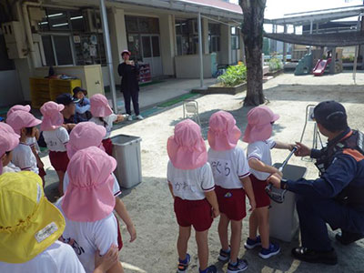 幼年消防クラブ員である幼稚園、保育園の子供たちは、消防職員と一緒に大きな声で「火事だ!火事だ!火事だ!」と周りに火災を知らせ、標的目掛けて力いっぱい放水している姿は、 ともて可愛らしいものでした。
