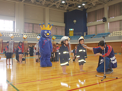 また、イミズレンジャーに扮した消防職員による防火寸劇が行われ、119番通報、地震時の行動、火災時の避難(お・は・し・も)について、クイズ形式で学び、危険性や対処方法について理解を深めました。